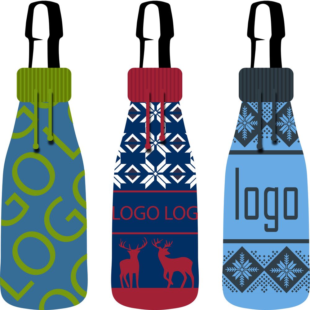Чехол на бутылку с вывязанным логотипом и индивидуальным рисунком в фирменной цветовой гамме. Такой чехол легко превратит любую бутылку в оригинальный подарок.